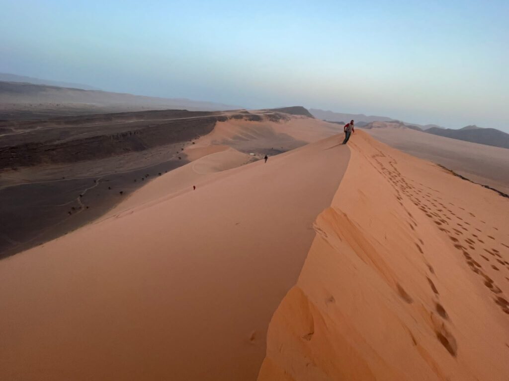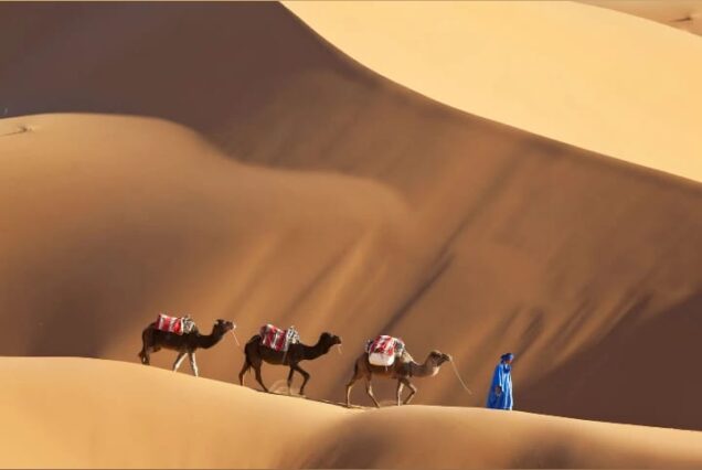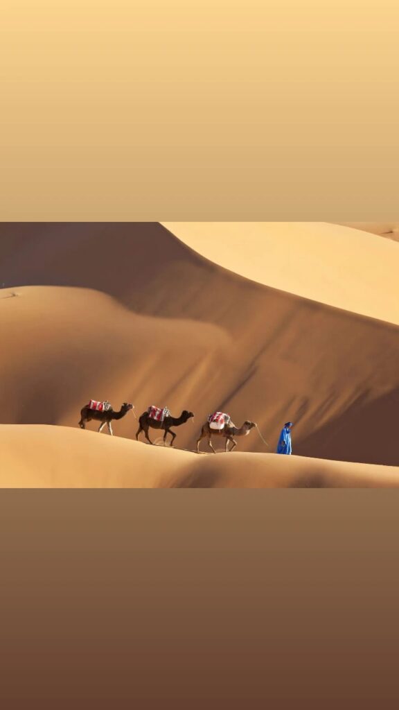 Départ le matin pour aller encore plus loin en désert vers Merzouga puis visite la vallée des milles kasbahs, Tinghir, gorge de Todgha, Erfoud, Rissani, arrivée dans l’après midi au désert Erg Chebbi.Rencontre les chameliers pour faire une balade à dos de dromadaire pour admirer le coucher de soleil ☀️ sur les dunes de sable puis rejoindre notre comp nuit et dîner dans un bivouac de luxe sous le ciel clair et plein des étoiles.Animation de groupe autour de feu .