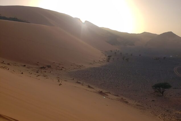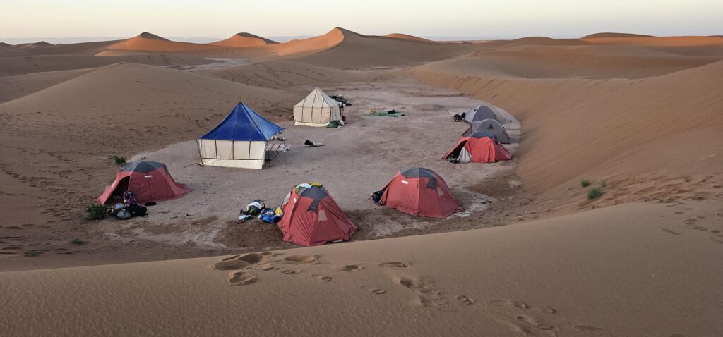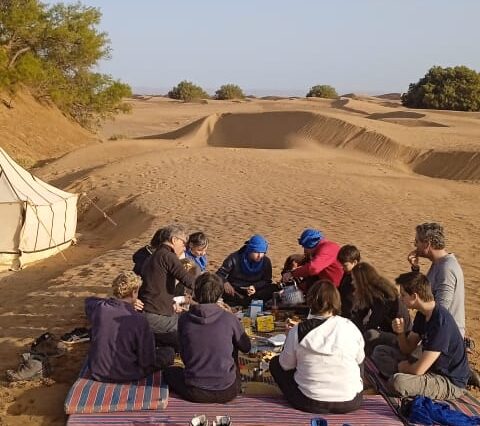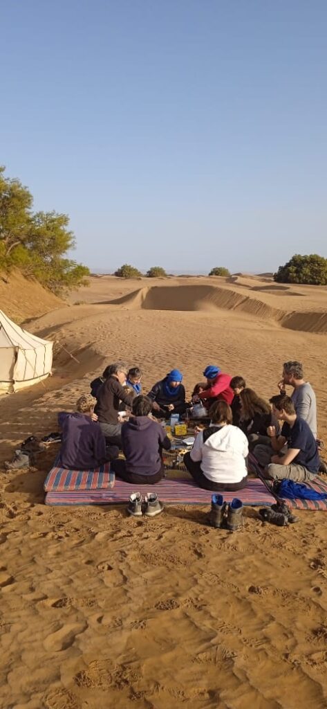 Superbe journées pleine de surprise .Avancée dans le reg ,un plateau minéral parsemé de tamaris et d’acacias, arbres qui résistent à des cilmats extrement secs .Au loin les villages de Bono et Ouled driss,et plein sud M’hamid .Belle vue sur les grands espaces , diner et nuit au milieu des dunes de Lahnaniche , 5 heure de marche .