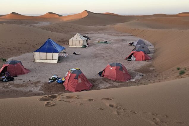 Nous quittons la porte du grand Sud pour la vallée du drâa , où la plus grande palmeraie du Maroc s’étire tout en longueur .Rencontre notre équipe chameliére à la sortie du village puis déjeuner sous les arbres .L’ aprés midi nous dérigons vers les dunes de Tidri diner et nuit en bivouac à côte du lac . 2h de marche et 3 h en vehicule.